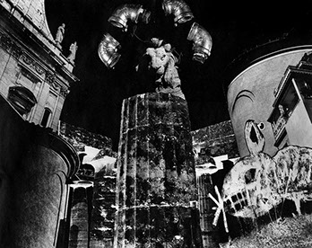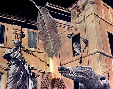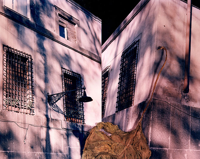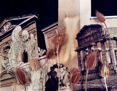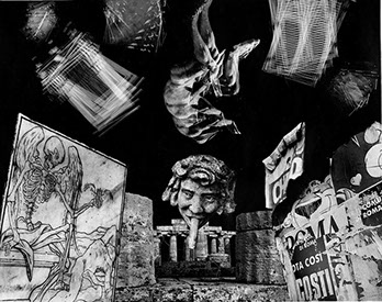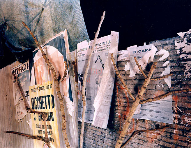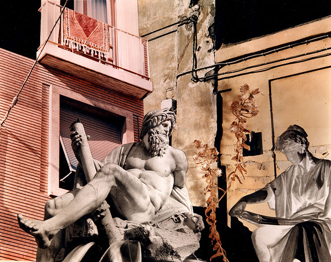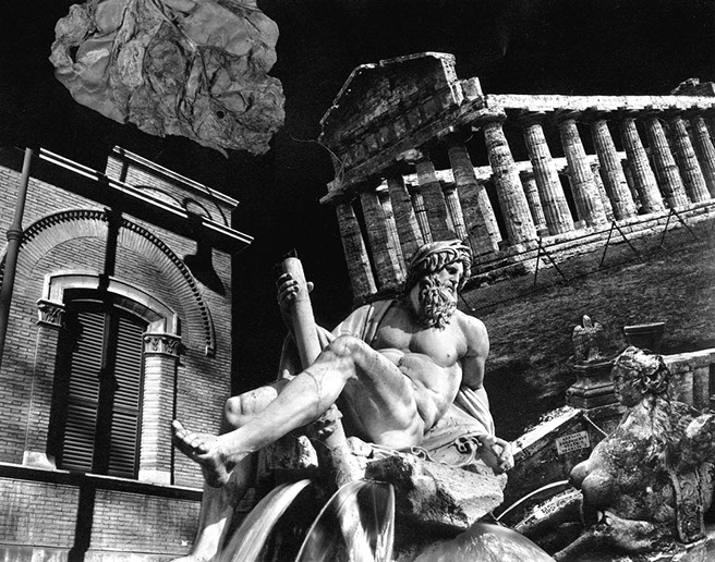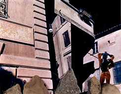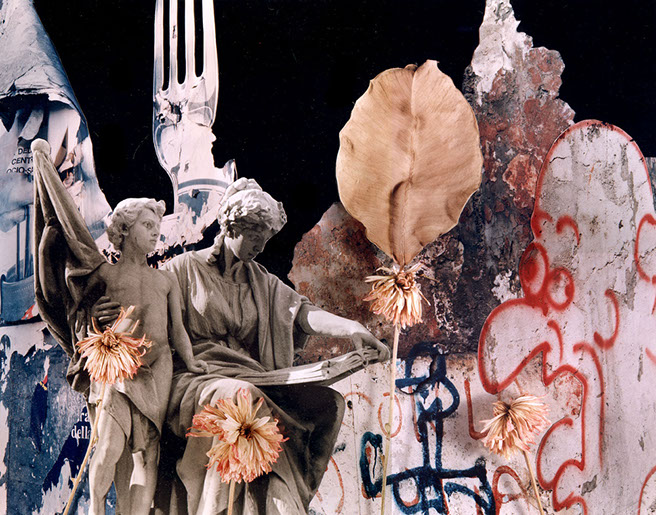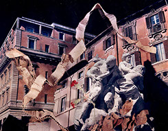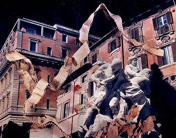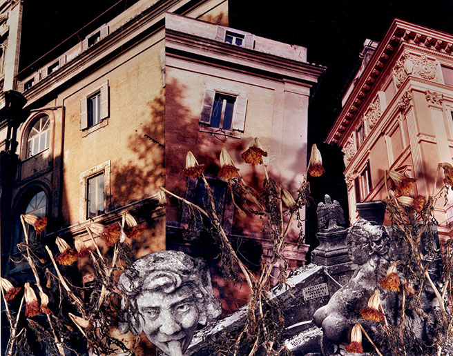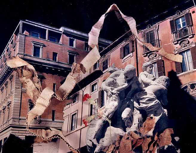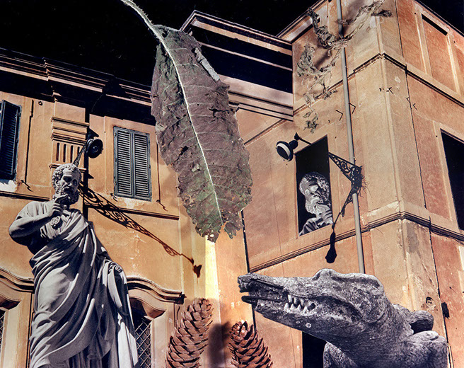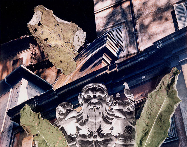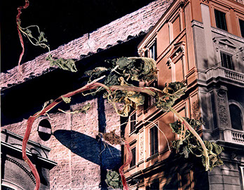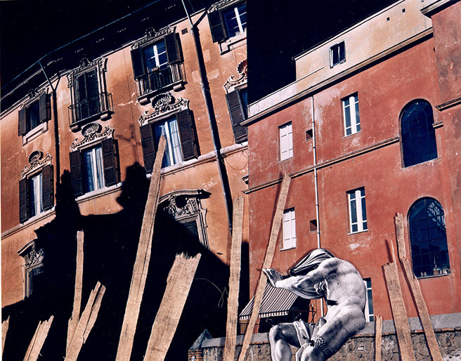 Rome is a mixture of contrasts and contradictions; ancient ruins, endless traffic, people hurrying everywhere, amazing classical churches and architecture. I photographed there in color with a 4x5 field camera and upon returning home printed the negatives on color papers, cut them into pieces which were then re-arranged in collages to express my experience of being in this wonderful and chaotic city.